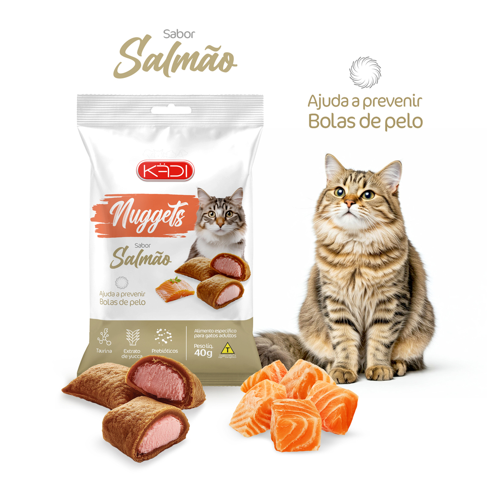 O Petisco KÄDI Nuggets Sabor Salmão é um snack funcional desenvolvido especialmente para gatos adultos de todas as raças. Elaborado com ingredientes nobres e selecionados, contém proteínas de excelente qualidade e é enriquecido com taurina, polpa de beterraba e acidificantes, contribuindo para a saúde geral do seu pet. Além disso, ajuda na prevenção da formação de bolas de pelos, promovendo o bem-estar e a disposição dos felinos. Com textura crocante e sabor irresistível de salmão, é uma excelente opção para recompensar e demonstrar carinho ao seu gatinho.