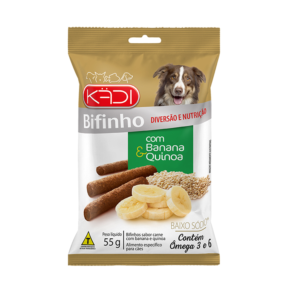Os Bifinhos KÄDI Naturais com Banana e Quinoa são petiscos funcionais elaborados com ingredientes naturais e sem corantes, ideais para promover diversão e nutrição ao seu pet.