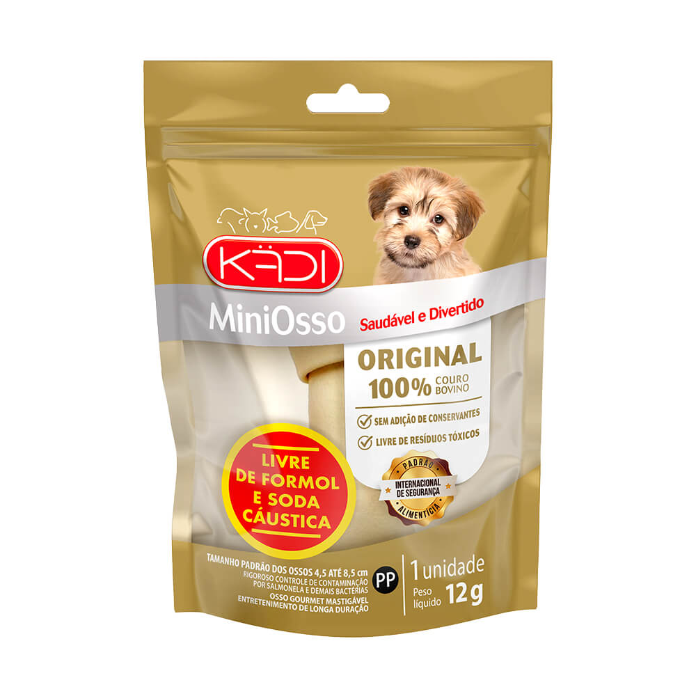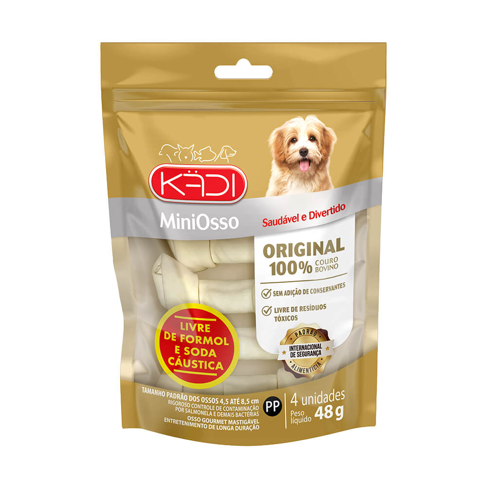 O Mini Osso KÄDI Original é um petisco mastigável feito com 100% couro bovino, indicado para cães de pequeno porte.