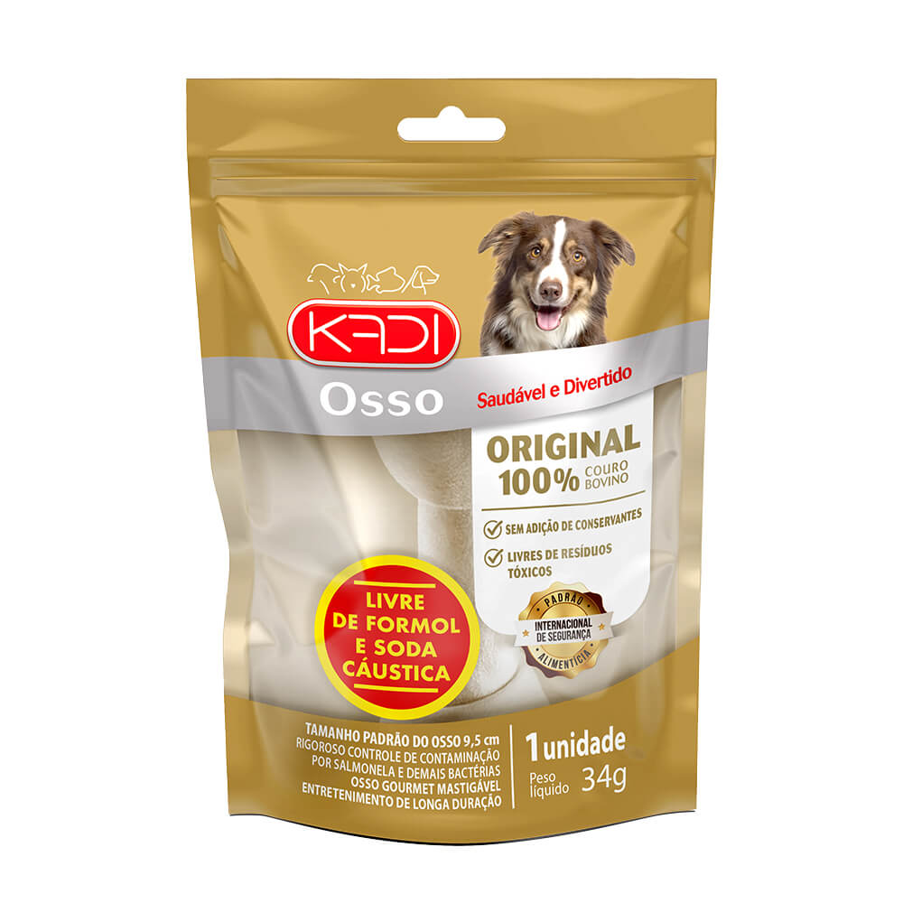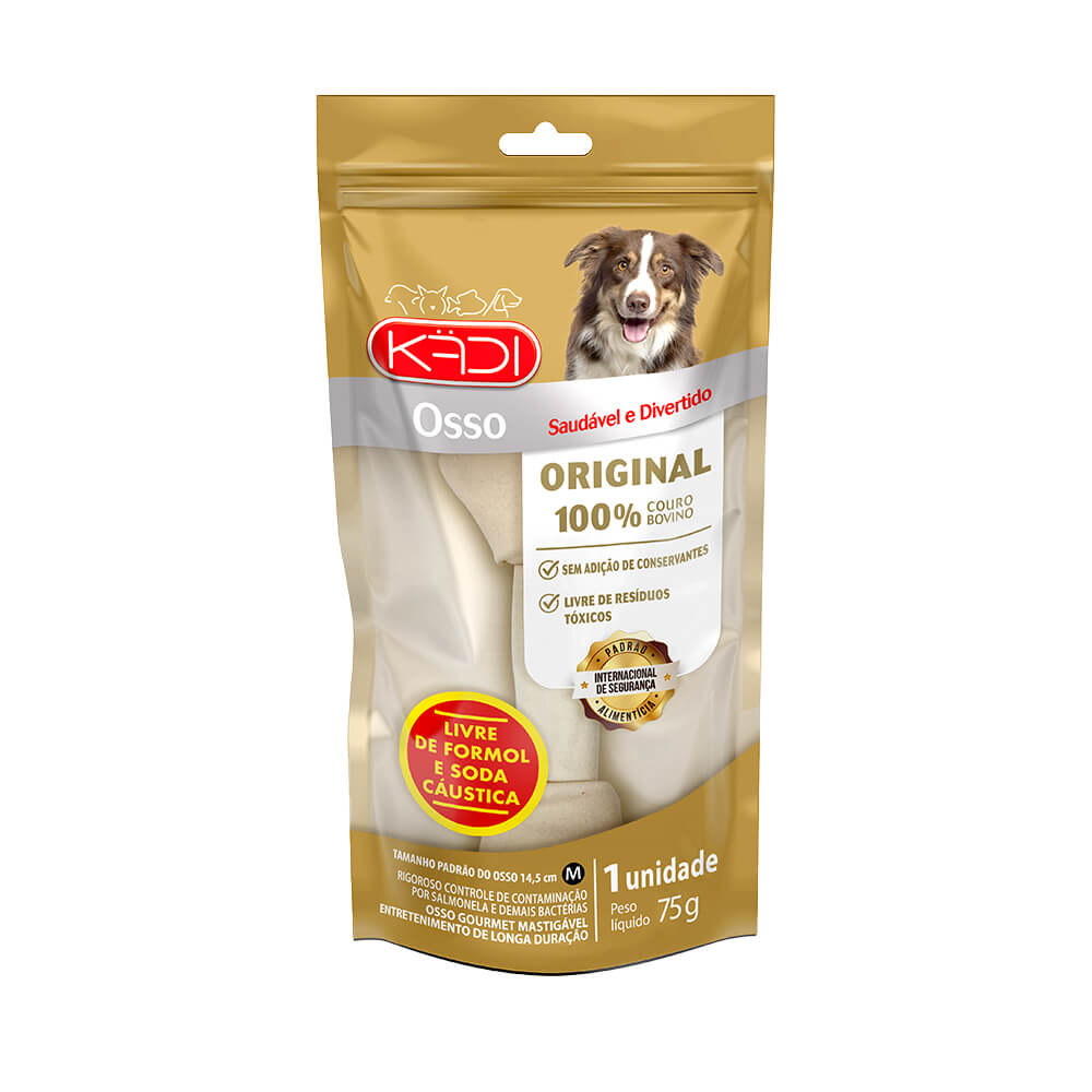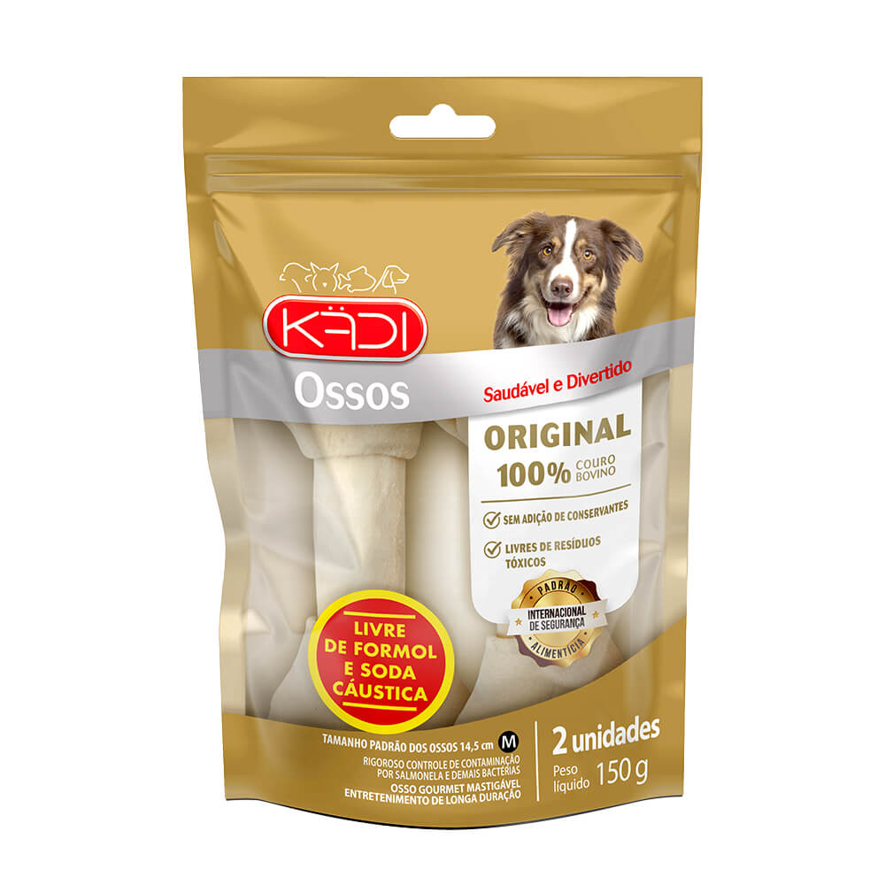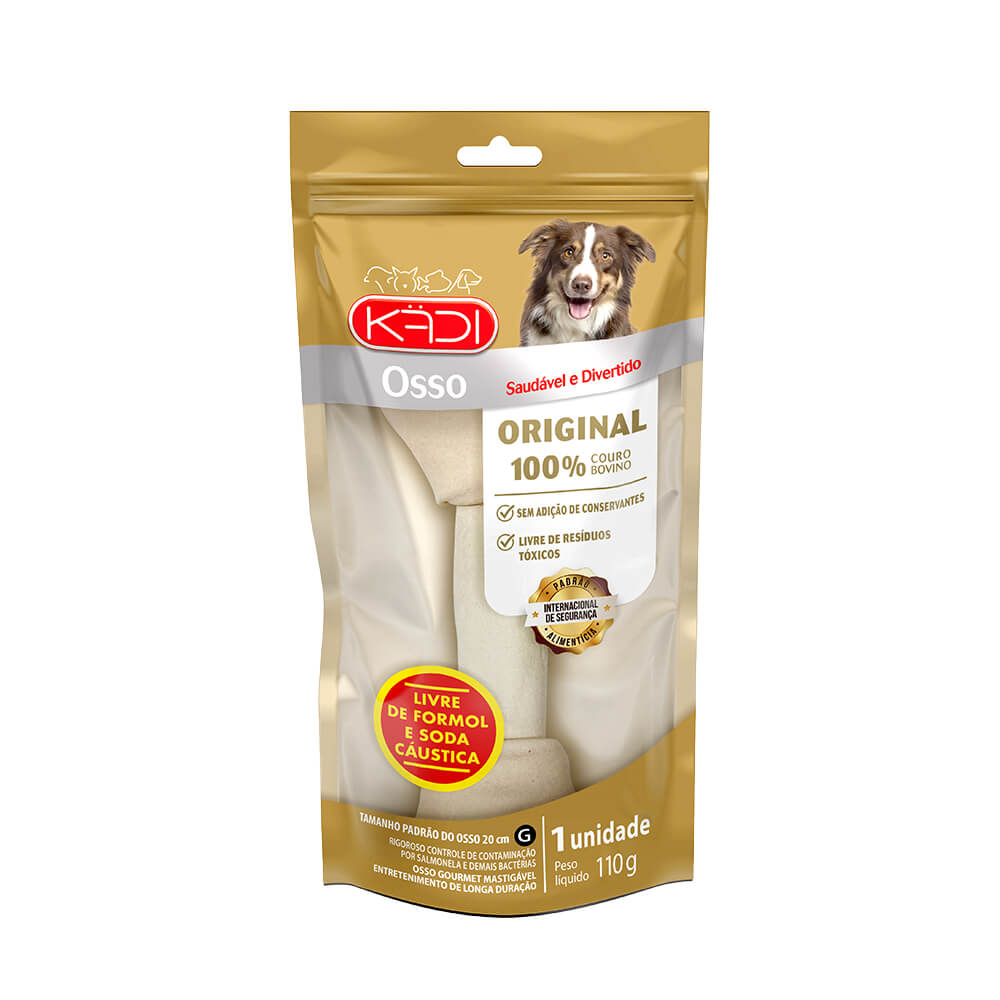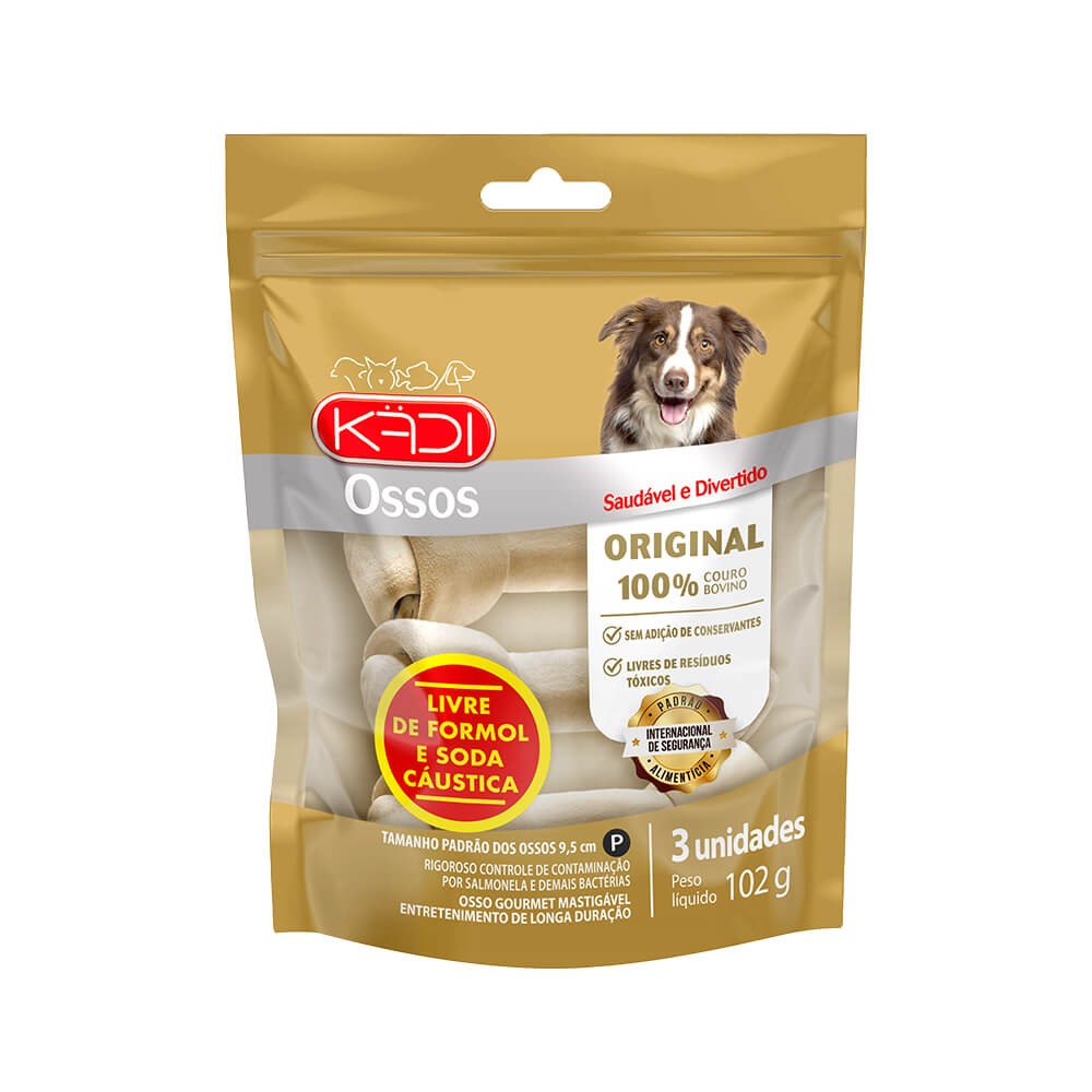 O Osso Pequeno KÄDI Original é um petisco natural feito com 100% couro bovino, sem formol, soda cáustica ou conservantes.